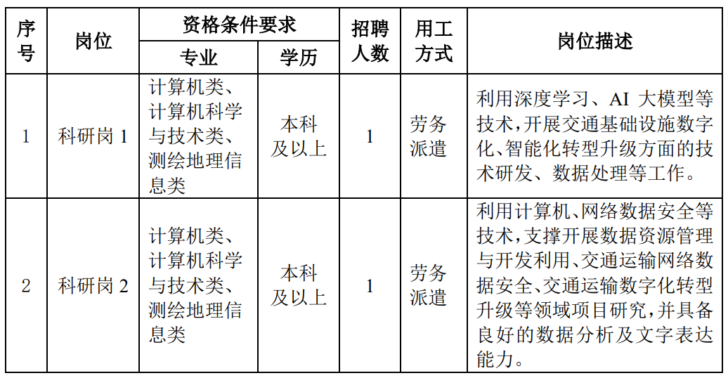 本次招聘采用劳务派遣方式,岗位具体要求如表1所示。