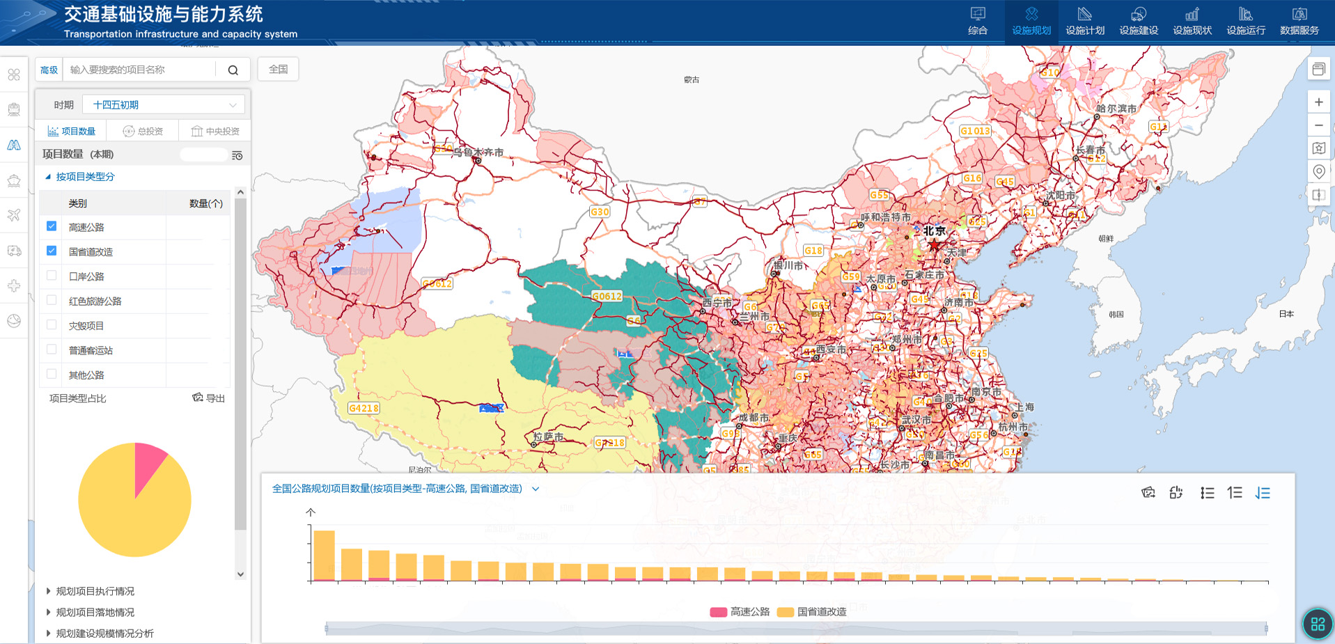 系统主要融合公路、桥梁、隧道、客货运站场、收费站、服务区、航道、港口、枢纽等基础设施属性信息、能力信息和电子地图信息,五年规划、中长期布局规划的电子地图信息、多媒体信息,并关联加载规划项目前期工作进展,建设项目投资计划、建设进展等信息,形成综合交通基础设施网络静态图;在此基础上,进一步加载已建设施客货运输量、交通流量等日常业务生产、运行数据,快速掌握基础设施日常运行信息,形成综合交通基础设施运行图。该系统全面提升了综合交通运输决策与管理的科学化、精细化水平,一是全面提升公路、水路、基础设施各环节的全景化展示能力,二是显著提高综合交通总体运行状况与发展水平的研判能力,三是有效加强交通重点建设项目重点流程的智能分析与预警能力,四是大幅提升综合交通辅助决策服务能力。