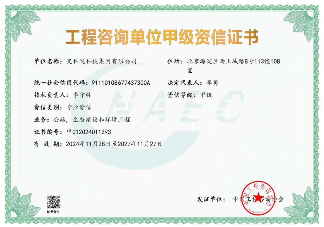 根据《工程咨询行业管理办法》(国家发展改革委2017年第9号令)、《工程咨询单位资信评价标准》(发改投资规〔2018〕623号)的有关规定及《中国工程咨询协会公告2024年第7号》的要求,在院的领导和有关部门、公司的大力配合下,集团公司认真组织开展并顺利完成2024年度工程咨询单位甲级资信申请工作。根据中国工程咨询协会评价结果公告,集团公司取得工程咨询单位甲级资信(公路专业、生态建设和环境工程专业)。