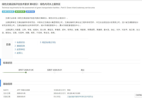 近日,由交通运输部组织制定,我院发展中心、标准中心牵头编制的推荐性行业标准《绿色交通设施评估技术要求 第6部分:绿色内河水上服务区》(JT/T 1199.6—2026)正式发布,并将于2026年5月1日起实施。