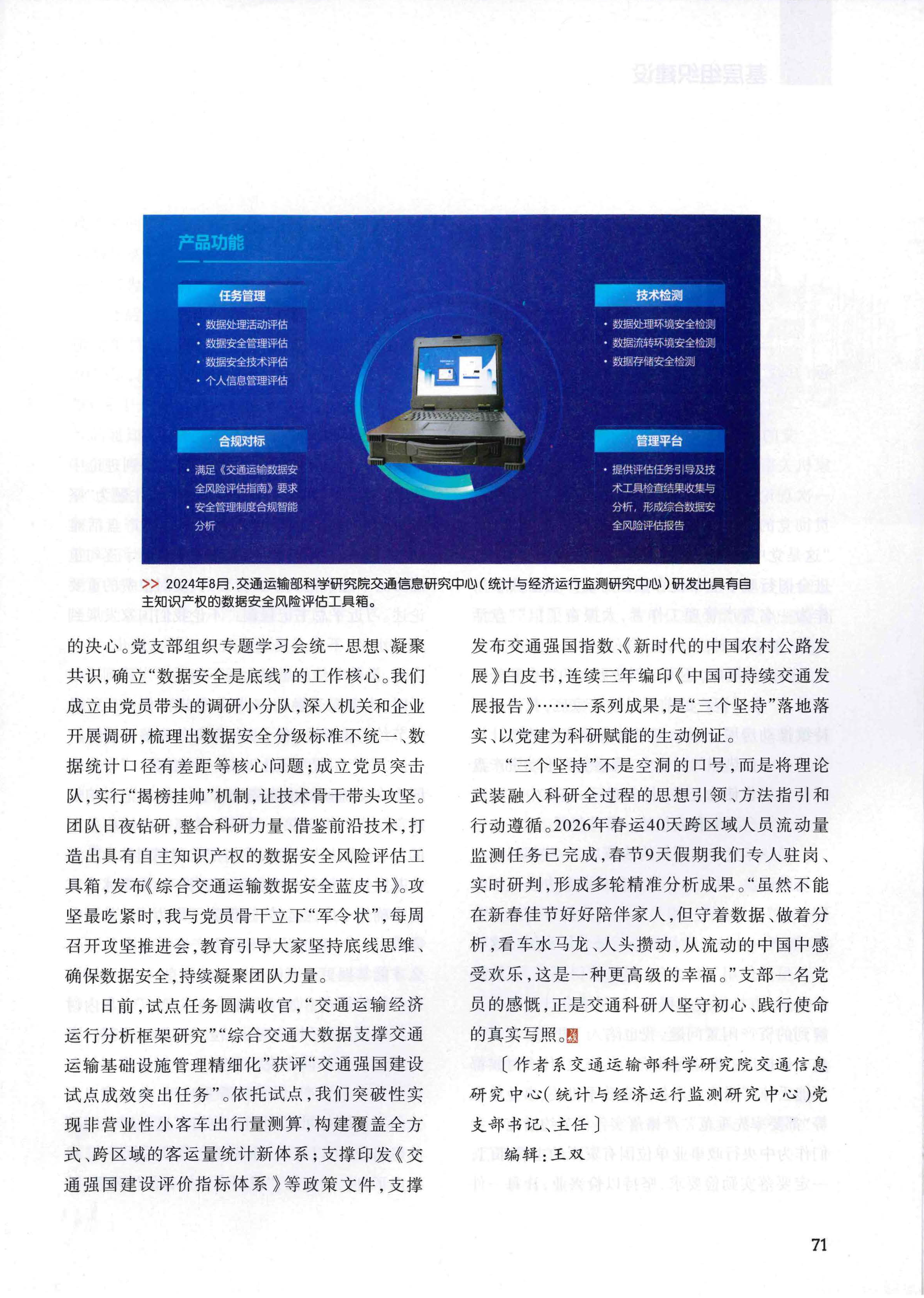 此次文章在《旗帜》杂志刊发,既是信息中心党支部以党建引领服务行业高质量发展经验做法和典型实践的集中展示,也是我院深度服务交通强国建设、主动融入国家发展大局的生动缩影,更是上级部门对我院坚持党建引领、推动党建与业务深度融合实践成效的充分肯定。下一步,院党委将继续统筹推进全院科研与党建工作深度融合,以更加扎实的科研成果、务实的工作作风为服务加快交通强国建设贡献更大力量。